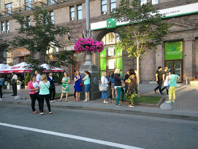 Для участия в мероприятии "Безвиз" с участием президента возле Укрсиббанка на Крещатике по состоянию на 19:45 собралось около двух десятков педагогов.