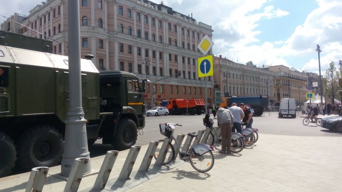 Вход на улицу перекрыли спецтехникой. К улице также стянуты автозаки и бронетехника. Перекрыты и смежные с Тверской улицы. Попасть на Тверскую можно только при наличии специального пропуска.