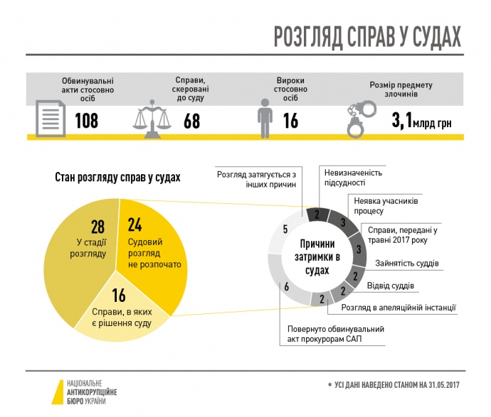 "Среди причин затягивания рассмотрения дел в судах: проблемы с определением подсудности, занятости и отвод служителей Фемиды, неявка участников процесса, возвращение обвинительного акта прокурорам САП, длительное рассмотрение в апелляционной инстанции и т.д.", - сообщает НАБУ.
