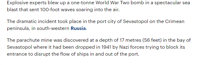 Сообщается, что бомба была обнаружена на глубине 17 метров в бухте Севастополя, куда она была сброшена в 1941 году.