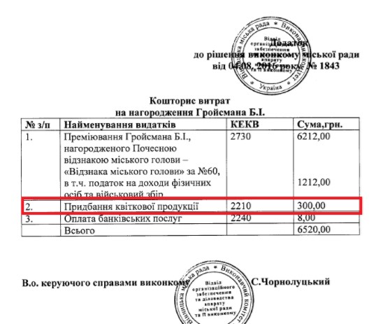 Исполнительный комитет Винницкого горсовета выделил более 6000 гривен депутату горсовета, отцу премьер-министра, Борису Гройсману "за значительный вклад в развитие города, весомые трудовые достижения".