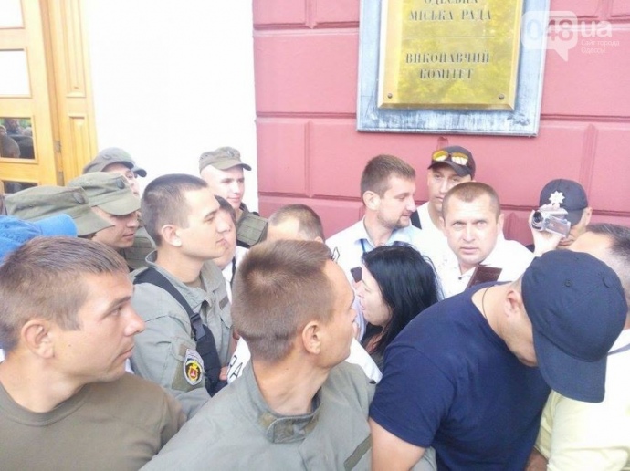 Небольшая потасовка между активистами нескольких общественных организаций и обманутыми инвесторами высотки, с одной стороны, и муниципальной охраной и сотрудниками Нацгвардии Украины, с другой, возникла утром у здания Одесского горсовета.