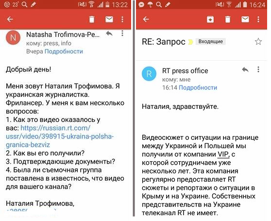 Наталья рассказала, что все эти интервью были записаны и переданы. Но в сюжет RT взяли лишь отрывок из одного из синхронов. Она продемонстрировала УП все записи, а также позволила УП опубликовать полный разговор с представительницей погранслужбы, часть которого использовали RT.