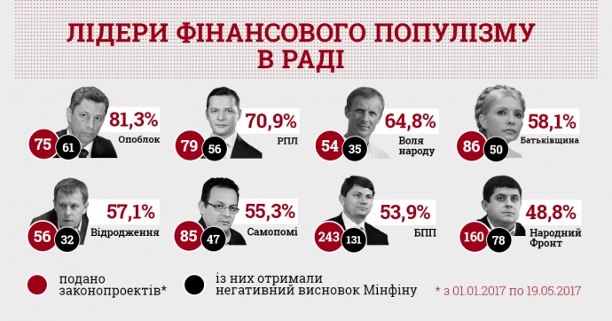 Таким образом, за январь-май депутаты Оппоблока подали 75 законопроектов, из которых 61, или 81%, получили отрицательное заключение Минфина.