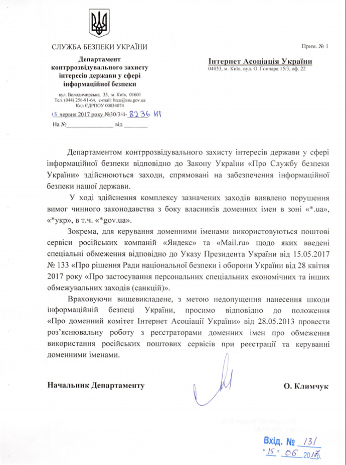 Об этом говорится в письме Департамента контрразведывательной защиты интересов государства в сфере информационной безопасности СБУ в адрес Интернет Ассоциации Украины от 13 июня, опубликованном на сайте ИнАУ.