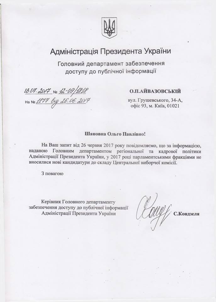 "По информации, предоставленной Главным департаментом региональной и кадровой политики Администрации Президента Украины, в 2017 году парламентскими фракциями не вносились новые кандидатуры в состав Центральной избирательной комиссии", - отмечается в ответе.