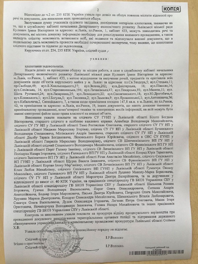 В постановлении Галицкого райсуда Львова сказано, что "проведение обыска обусловлено необходимостью выявления и фиксации сведений об обстоятельствах совершения уголовного преступления, поиска и изъятия вещей, предметов и оригиналов всех документов в отношении объектов недвижимого имущества в г. Львове, которые незаконным путем выбыли из коммунальной собственности территориальной громады Львова".
