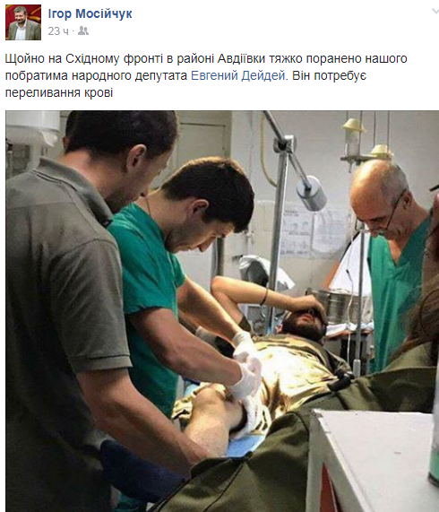 Как известно, в пятницу вечером, в последний рабочий день сессии Мосийчук в своем ФБ написал о ранении Дейдея. При этом он написал, что Дейдею нужна кровь для переливания. Позже Мосийчук написал, что Дейдея доставляют вертолетом в Днепр.