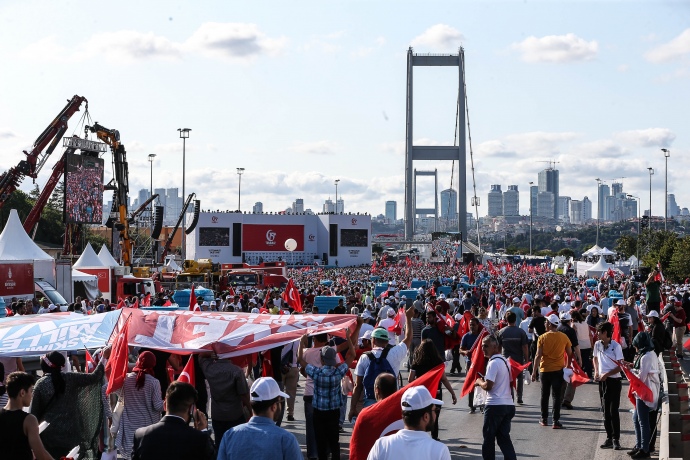 В Турции в день годовщины несостоявшегося "переворота" тысячи людей принимают участие в многочисленных митингах и шествиях.