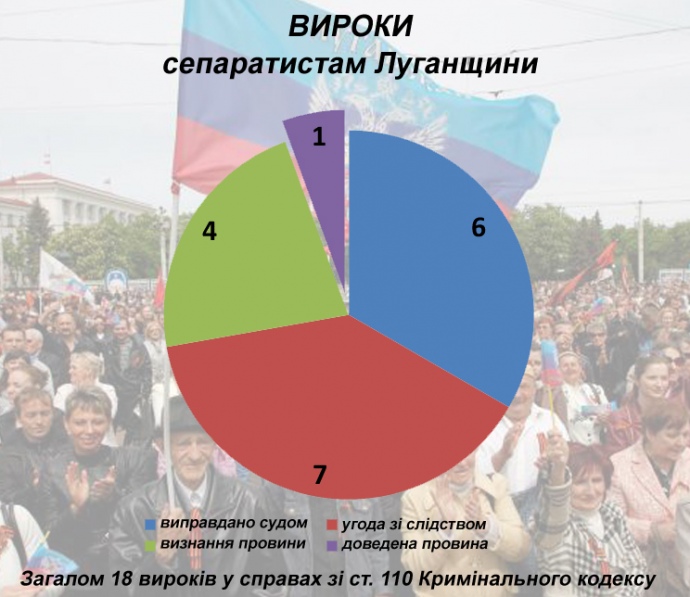 К началу июля в реестре судебных решений находился 31 приговор судов Луганской области, в тексте которых упоминался "референдум". Из них в 18 делах обвиняемым инкриминировалась 110-я статья УК. В других случаях "референдум" упоминался в контексте создания "ЛНР", а обвиняемые были либо боевиками, или препятствовали деятельности Вооруженных Сил Украины.