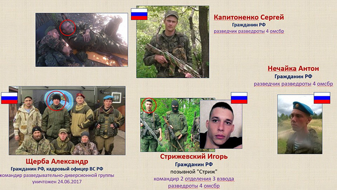 "Начальник разведки 4 бригады майор ВС РФ Данилов Сергей Николаевич. В июне состоялась ротация, до этого - майор Каменев Антон Валерьевич (позывной "Мангуст"). Командир разведывательной роты - лейтенант Алексей Калугин (позывной "Калуга"). Командиры разведывательных взводов и отделений этой разведроты - все граждане России, контрактники ВС РФ: Полетаев Станислав Александрович (позывной Таллер), Карасев Валерий Александрович (позывной "Карась"), Архипов Владимир Александрович (позывной "Тайга"), Хилько Михаил Михайлович (позывной "Скиф"), Стрижевский Игорь Леонидович (позывной "Стрижак"), Кандауров Анатолий Анатольевич (позывной "Веселый").