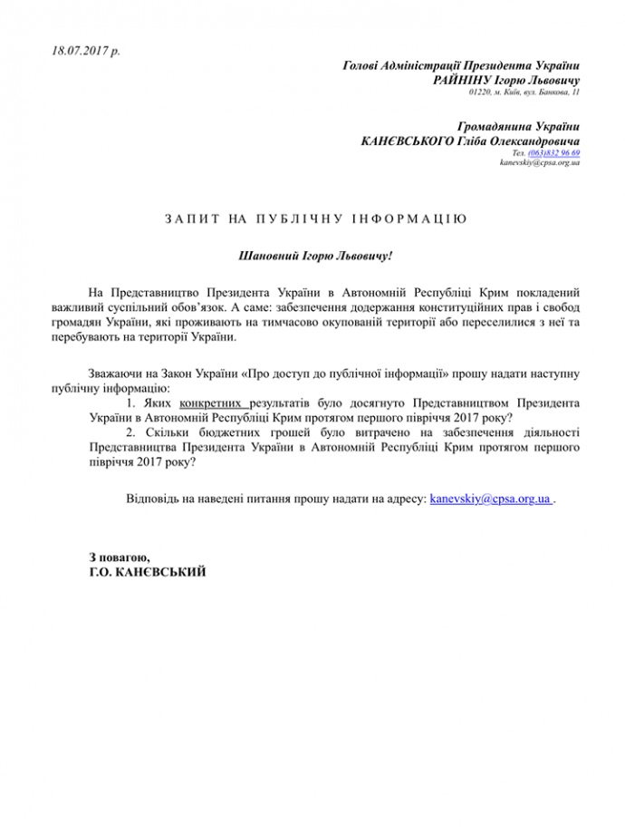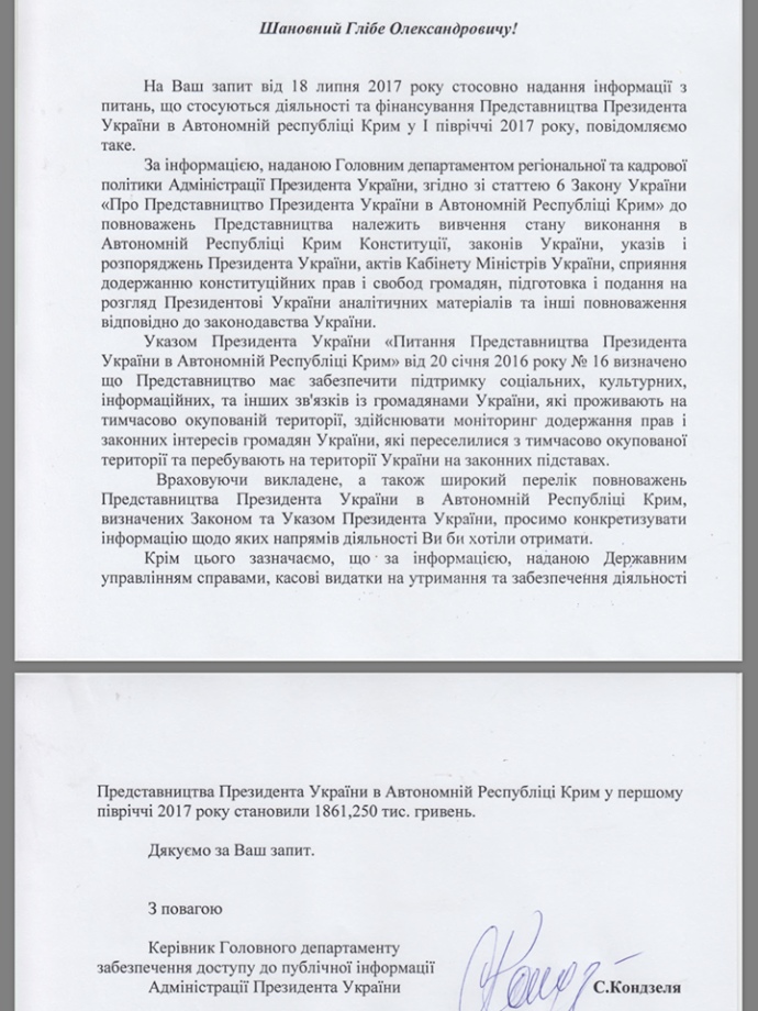 В то же время на вопрос о затратах на представительства Каневскому сказали следующее: "По информации, предоставленной Государственным управлением делами, кассовые расходы на содержание и обеспечение деятельности представительства президента Украины в Автономной Республике Крым в первом полугодии 2017 года составили 1861, 250 тыс. гривен".