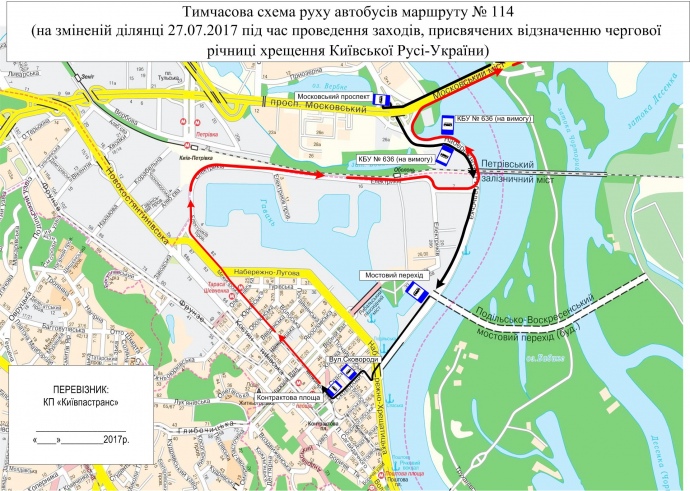 Так, 27 июля с начала движения до окончания мероприятий (ориентировочно до 16:30) вносятся изменения в работу автобусов №№ 24, 55, 62, 114 и троллейбусов №38 на период закрытия движения всех видов транспорта на ул. Трехсвятительской, ул. Крещатик (на отрезке от ул. Б. Хмельницкого до Европейской площади), Владимирском спуске, ул. Грушевского (на участке от ул. Шелковичной до Европейской площади).