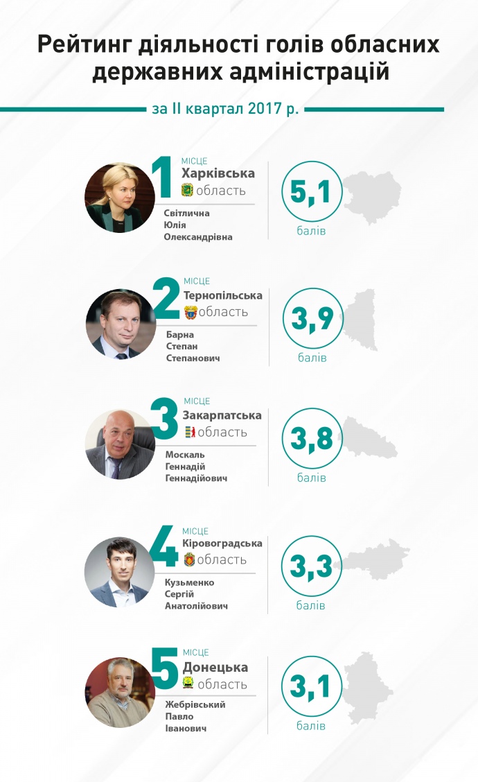 В то же время, по заключению комитета, возглавили рейтинг председатели Харьковской (Юлия Светличная), Тернопольской (Степан Барна), Закарпатской (Геннадий Москаль), Кировоградской (Сергей Кузьменко) и Донецкой (Павел Жебривский) областных государственных администраций.
