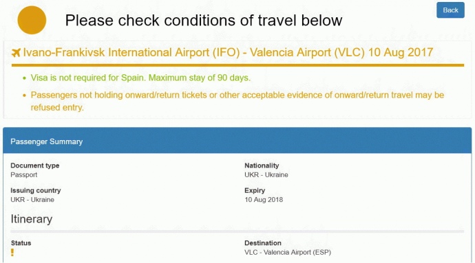 Богдана Шелефонтюк утверждает, что у нее был билет в Испанию на прямой рейс авиакомпании МАУ PS939 в Валенсию, который должен был улететь из Ивано-Франковска еще 31 июля. Однако на стойке регистрации ей отказали в посадке на самолет из-за того, что у пассажирки не было обратного билета – билет был куплен только в одну сторону.
