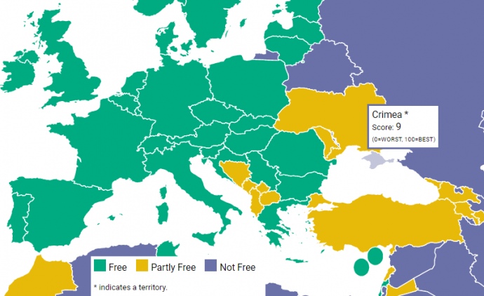 По оценке Freedom House, свобода в аннексированном Крыму, как и в России, исчисляется от 0 до 10 баллов, что является наихудшим показателем (максимальное количество баллов - 100).