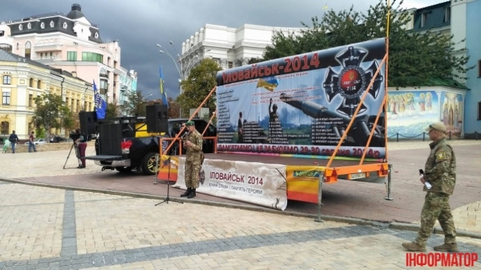 Около 200 человек проводят акцию на Михайловской площади в Киеве в память о бойцах антитеррористической операции, погибших во время боевых действий в Иловайске Донецкой области в августе 2014 года.
