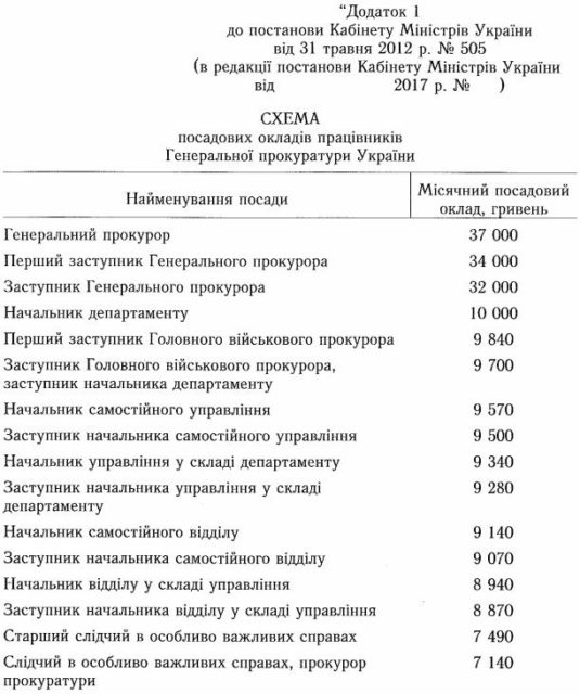 Новые должностные оклады генпрокурора и его заместителей составят 32-37 тысяч грн. Кабмин отменил норму, согласно которой оклад генпрокурора ранее составлял 18,5 минимальных заработных плат – 6 тыс 142 грн, первого зама – 15,8 минимальных зарплат или 5 тыс 245 грн, зама – 14,8 минимальных зарплат или 4 тыс 914 грн.