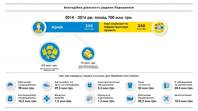 Фонд Петра Порошенко в мае отчитывался о том, что за 2014-2016 годы пожертвовал более 700 миллионов гривен на благотворительность, из них половину якобы потратили на нужды армии, а еще 350 миллионов – на социальные и инфраструктурные проекты.