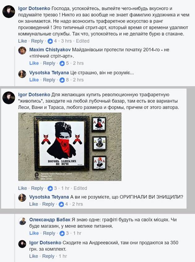 "Мы их не удаляли. Я никому никаких указаний не давал. Я не заинтересован был это делать. Эти граффити были созданы в мой день рождения 12 февраля 2014 года. Во время революции ночью пришли ребята и спросили – мы здесь разрисовываем стены. А я говорю: а чего вы спрашиваете? Делайте", – сказал Доценко.