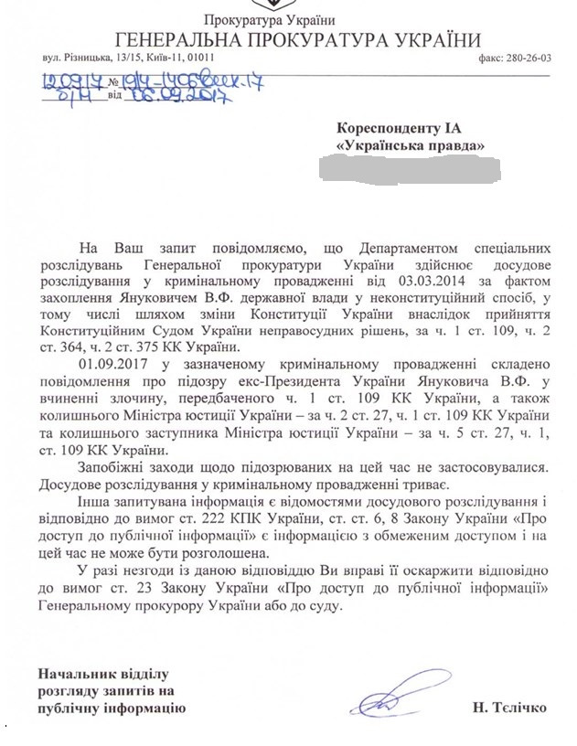 "Другая запрашиваемая информация является сведениям досудебного расследования и ... являются информацией с ограниченным доступом и в настоящее время не может быть разглашена", - ответили в ГПУ на вопрос, какие следственные действия по этому производству были осуществлены.