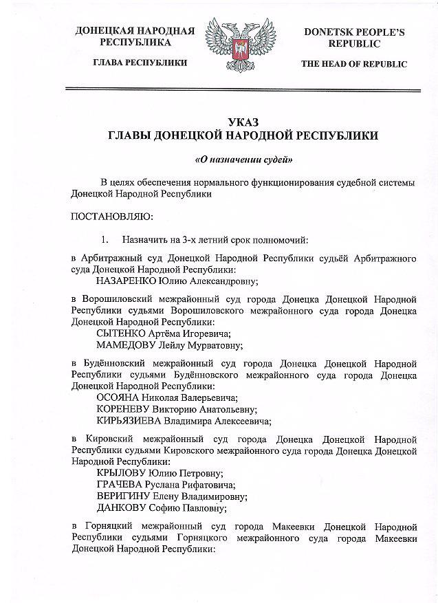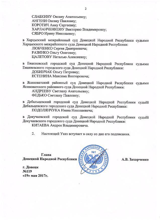 В то же время на сайте под названием "Верховный суд Донецкой Республики" опубликован "Указ Главы Донецкой Народной Республики" О назначения судей "от 19 мая 2017 года № 119, где речь идет о назначении 24 судей, часть из которых ранее были судьями Украины.