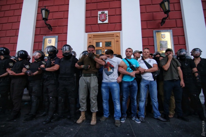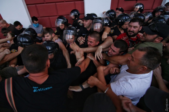 Когда люди попытались зайти в здание, произошла потасовка с муниципальной службой охраны. Разбиты входные двери горсовета. Люди обещают стоять, пока не придет мэр Одессы Геннадий Труханов.