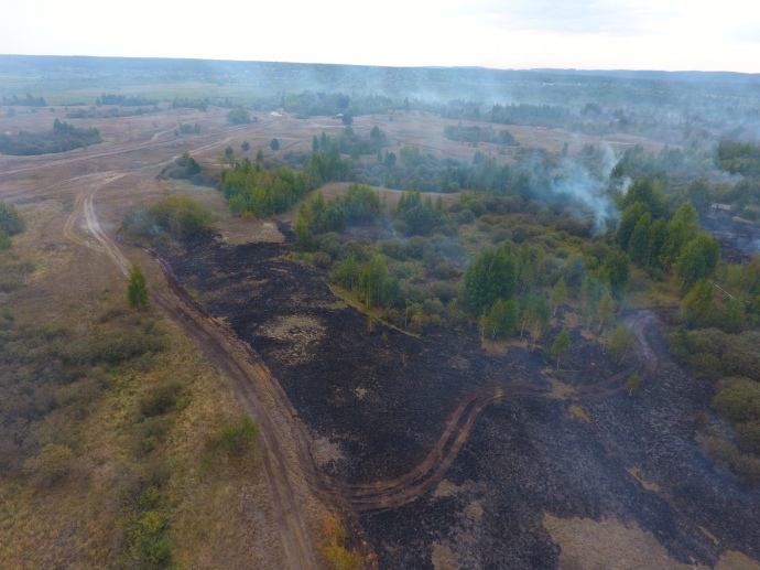 Мобильно-оперативная группа на месте происшествия обнаружила очаги сгоревшей сухой растительности на площади около 51 га. Также зафиксированы очаги возгорания торфяного грунта.