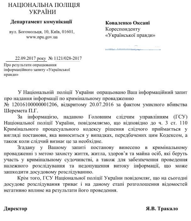 Главное следственное управление Нацполиции заявляет, что засекретило все судебные решения по делу об убийстве Павла Шеремета для защиты жизни лиц, "которые участвуют в уголовном судопроизводстве".