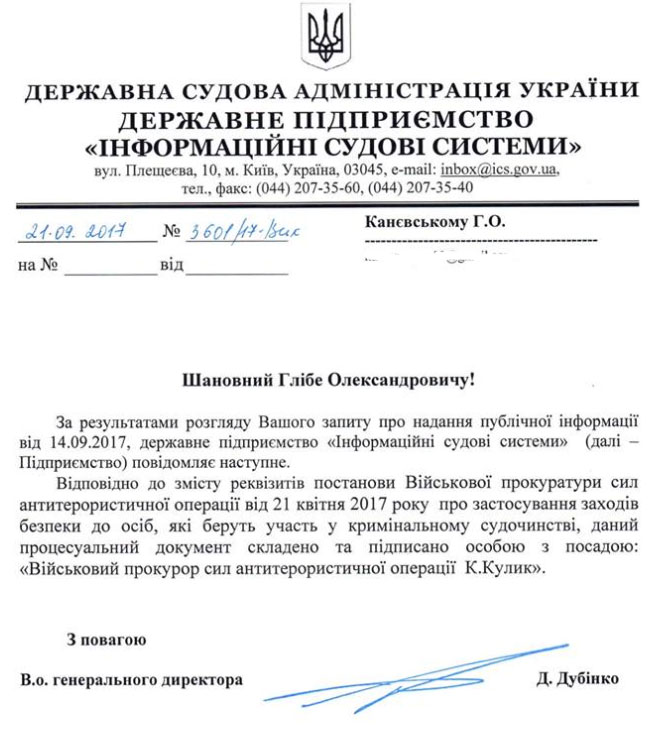 "Согласно содержанию реквизитов постановления Военной прокуратуры сил АТО от 21 апреля 2017 о применении мер безопасности к лицам, которые принимают участие в уголовном судопроизводстве, данный процессуальный документ составлен и подписан лицом с должности "Военный прокурор сил АТО К. Кулик"", - сказано в ответе.