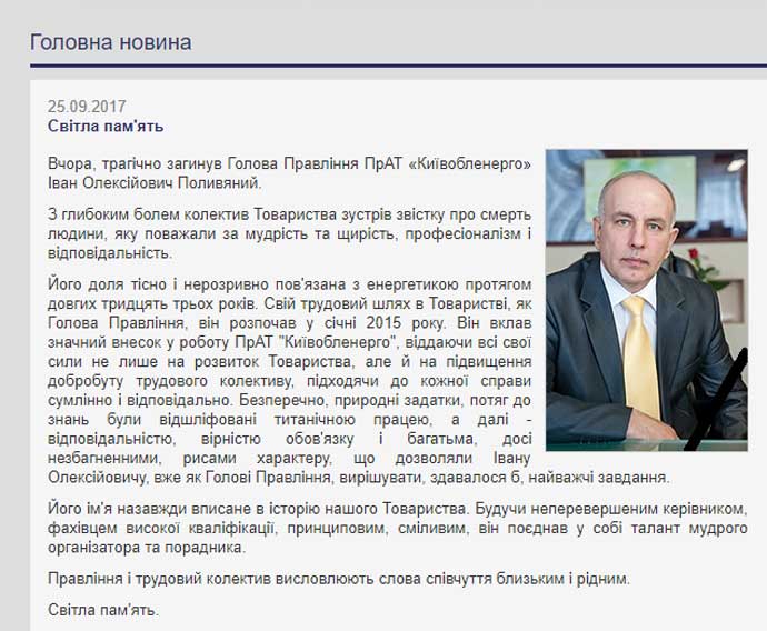 На сайте "Киевоблэнерго" сообщается, что в воскресенье трагически погиб председатель правления ЧАО "Киевоблэнерго" Иван Алексеевич Полывяный.