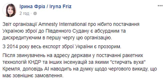 "Отчет организации Amnesty International о якобы поставках Украиной оружия в Южный Судан является абсурдным и дискредитирующим в первую очередь эту организацию", - написала она.