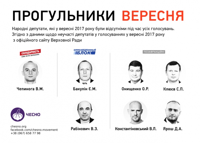 Общественное движение "Чесно" инициировало кампанию по ежемесячному обнародованию списка нардепов-прогульщиков. Цель кампании – привлечь внимание к одной из самых больших проблем работы Верховной Рады – низкой посещаемости заседаний народными депутатами и их неучастию в голосовании.