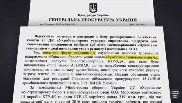 "Обнаружены факты злоупотребления служебным положением при производстве корпусов бронетранспортеров, для которых была использована сталь марки, не предусмотренная конструкторской документацией и имеющая низкую пулестойкость, в результате чего создана реальная угроза жизни и здоровью военнослужащих", – одно из них.