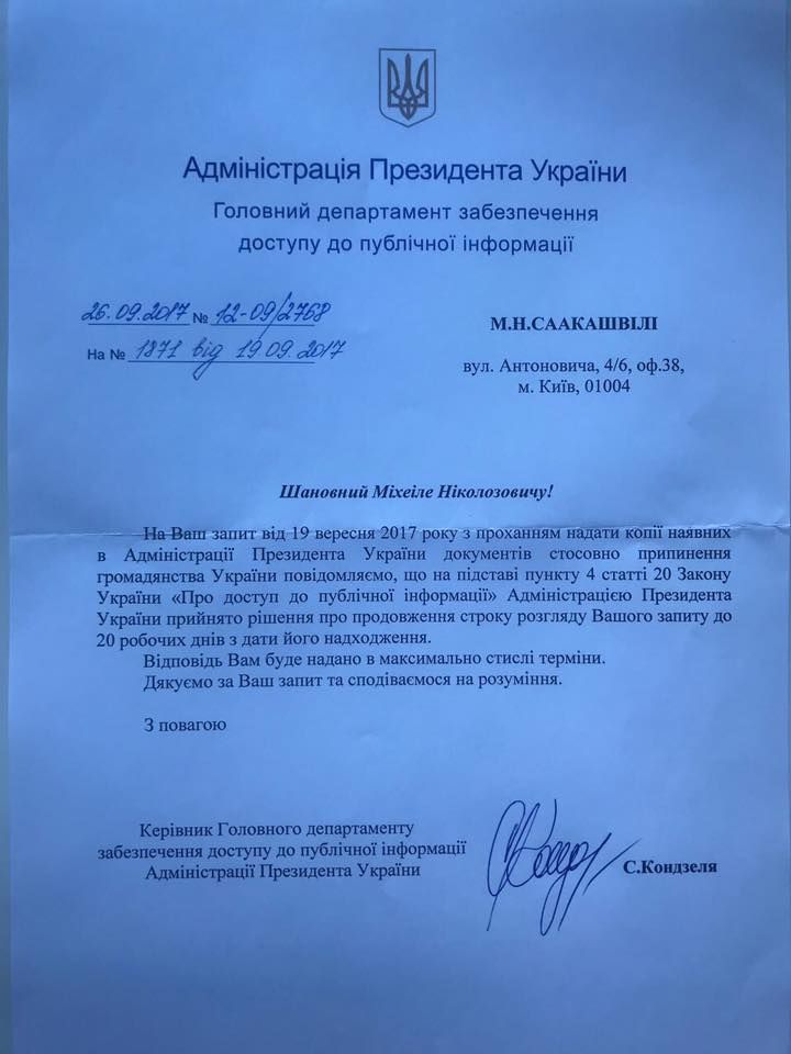 Администрация президента взяла дополнительное время на рассмотрение запроса лидера партии "Рух нових сил" Михаила Саакашвили по поводу документов о лишении его гражданства.