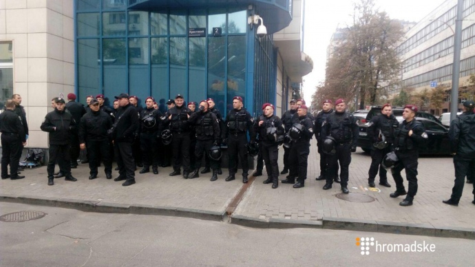 Представители ОО "Майдан" пришли их поддержать, в то время как С14 выступали за то, чтобы полицейским избрали меру пресечения.
