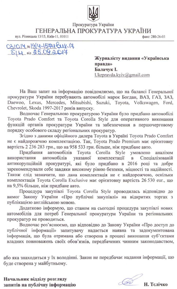 Как известно, ранее СМИ сообщали, что ГПУ таки купила 15 Toyota Corolla в самой дорогой комплектации и 2 внедорожника Toyota Land Cruiser 150 Prado 2.8 Comfort по 1,28 миллиона гривен каждый.