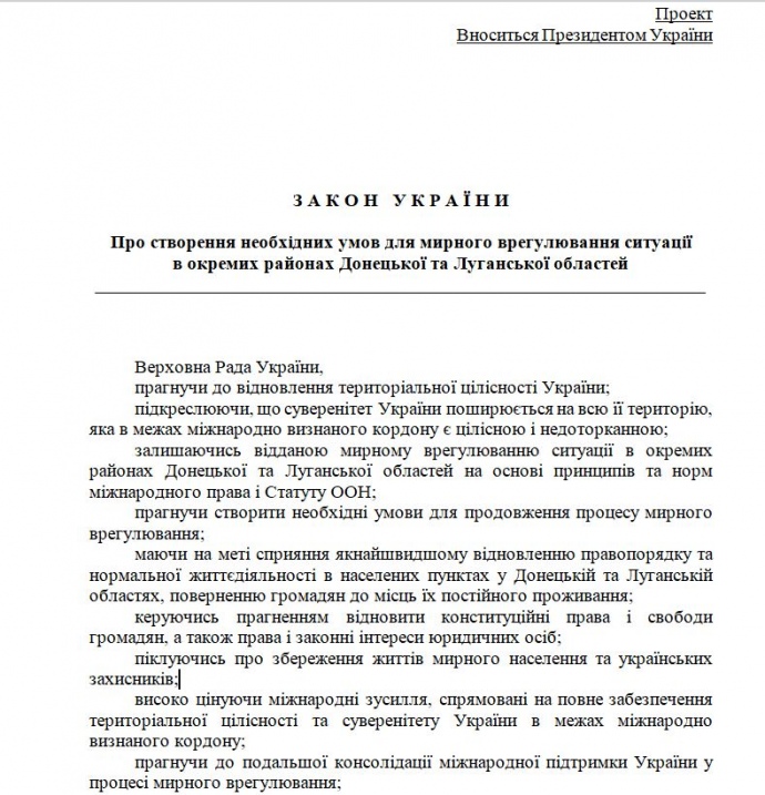 Как известно, 4 октября Порошенко внес на рассмотрение парламента два законопроекта - "Об особенностях государственной политики по обеспечению государственного суверенитета Украины над временно оккупированными территориями в Донецкой и Луганской областях" и "О создании необходимых условий для мирного урегулирования ситуации в отдельных районах Донецкой и Луганской областей".