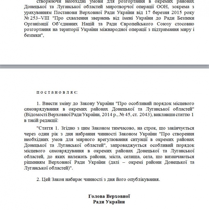 "Статья 1. Согласно этому Закону временно, на срок, который заканчивается через один год со дня вступления в силу Закона Украины "О создании необходимых условий для мирного урегулирования ситуации в отдельных районах Донецкой и Луганской областей", вводится особый порядок местного самоуправления в отдельных районах Донецкой и Луганской областей...", - будет говориться в новой редакции т.н. закона "об особом статусе" Донбасса.