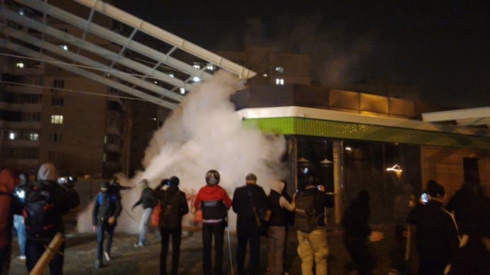 Около 20:45 между митингующими и правоохранителями произошли столкновения, участники акции бросали дымовые шашки, бутылки и распыляли огнетушители.
