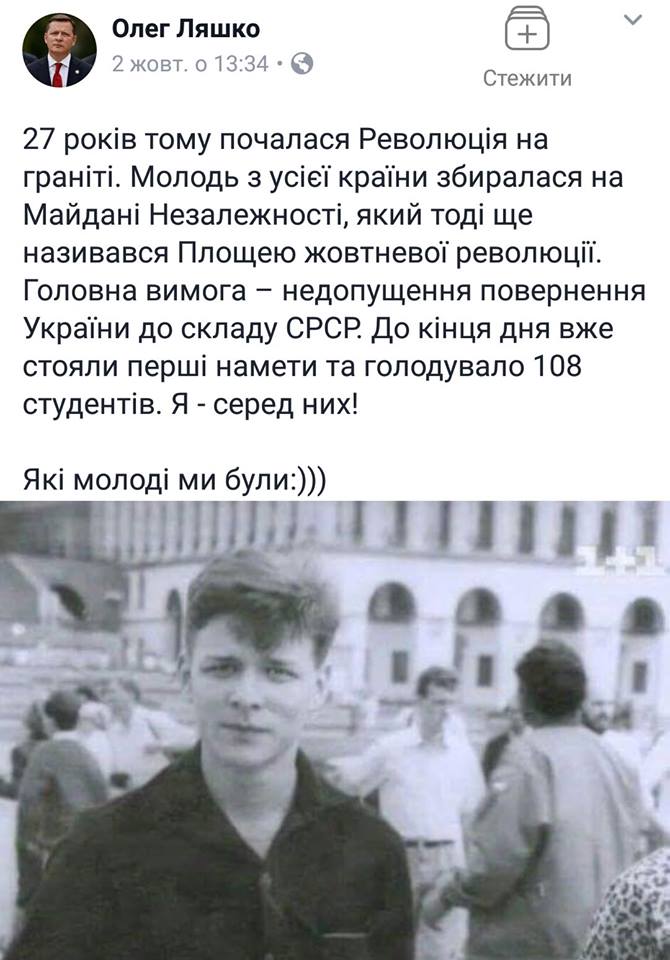 Участники "Революции на граните" возмутились заявлениями лидера Радикальной партии Олега Ляшко относительно его участия в студенческой голодовке в Киеве в 1990 году.