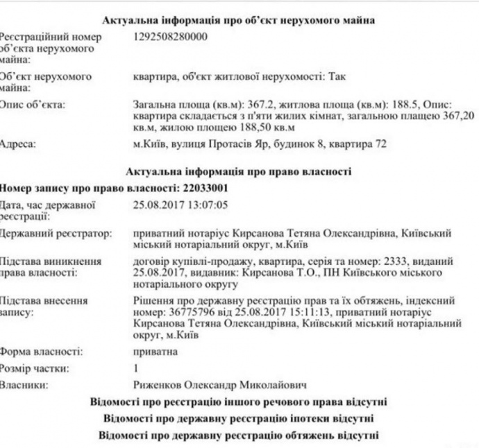 Согласно ей, Рыженков 25 августа 2017 купил 5-комнатную квартиру общей площадью 367,2 кв. м. Расположена она по адресу г.. Киев, ул. Протасов Яр 8, кв 72. По этому адресу в Киеве расположен жилищный комплекс "Альпийский городок".