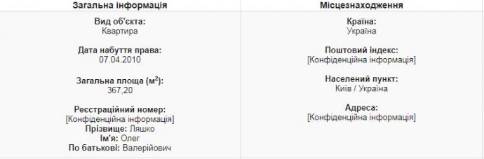 В декларации Ляшко за 2016 указаны две квартиры в Киеве, одна из которых площадью 367,2 кв. м. Право собственности на нее он получил в 2010 году.