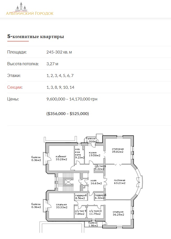На сайте комплекса указывается, что цены на 5-комнатные квартиры составляют от 9,5 млн грн до 14,17 млн грн.