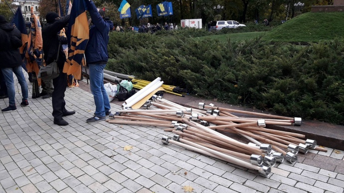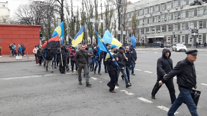 Активисты держат национальную символику, флаги "Национального корпуса", "Правого сектора" и "Свободы".