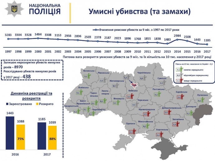 По его данным, за 9 месяцев текущего года произошло 1185 умышленных убийств и покушений, что является самым низким показателем за последние 10 лет.