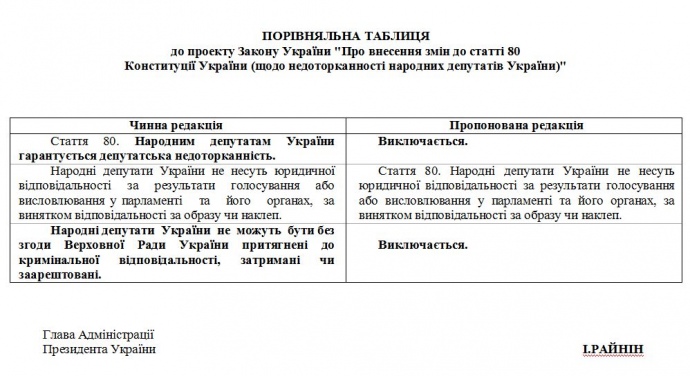 При этом из данной статьи президент предлагает исключить, что "народным депутатам гарантируется депутатская неприкосновенность" и "народные депутаты не могут быть без согласия Верховной Рады привлечены к уголовной ответственности, задержаны или арестованы".