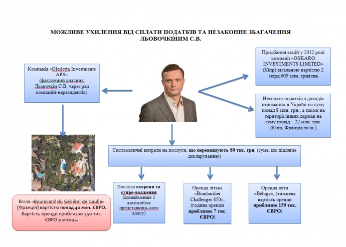 Также там утверждают, что во время расследования получили информацию о том, что "Левочкин С.В. через подконтрольные ему оффшорные компании легализовал часть добытых преступным способом средств путем приобретения многочисленных объектов недвижимости в различных странах мира".