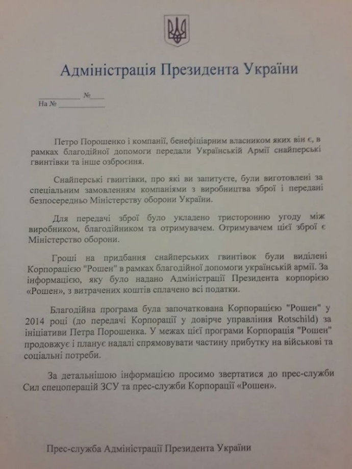 "Петр Порошенко и компании, бенефициарным владельцем которых он является... передали украинской армии снайперские винтовки и другое вооружение", - говорится в ответе.