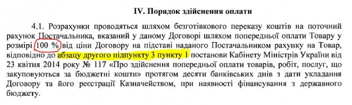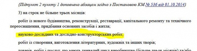 При этом предусмотрена полная предоплата в течение 10 банковских дней с даты подписания договора со ссылкой на абзац 2-й подпункта 3 пункта 1 постановления Кабмина от 23 апреля 2014 №117. В указанном абзаце говорится о предоплате на срок не более трех месяцев при закупке научно-исследовательских и опытно-конструкторских работ.